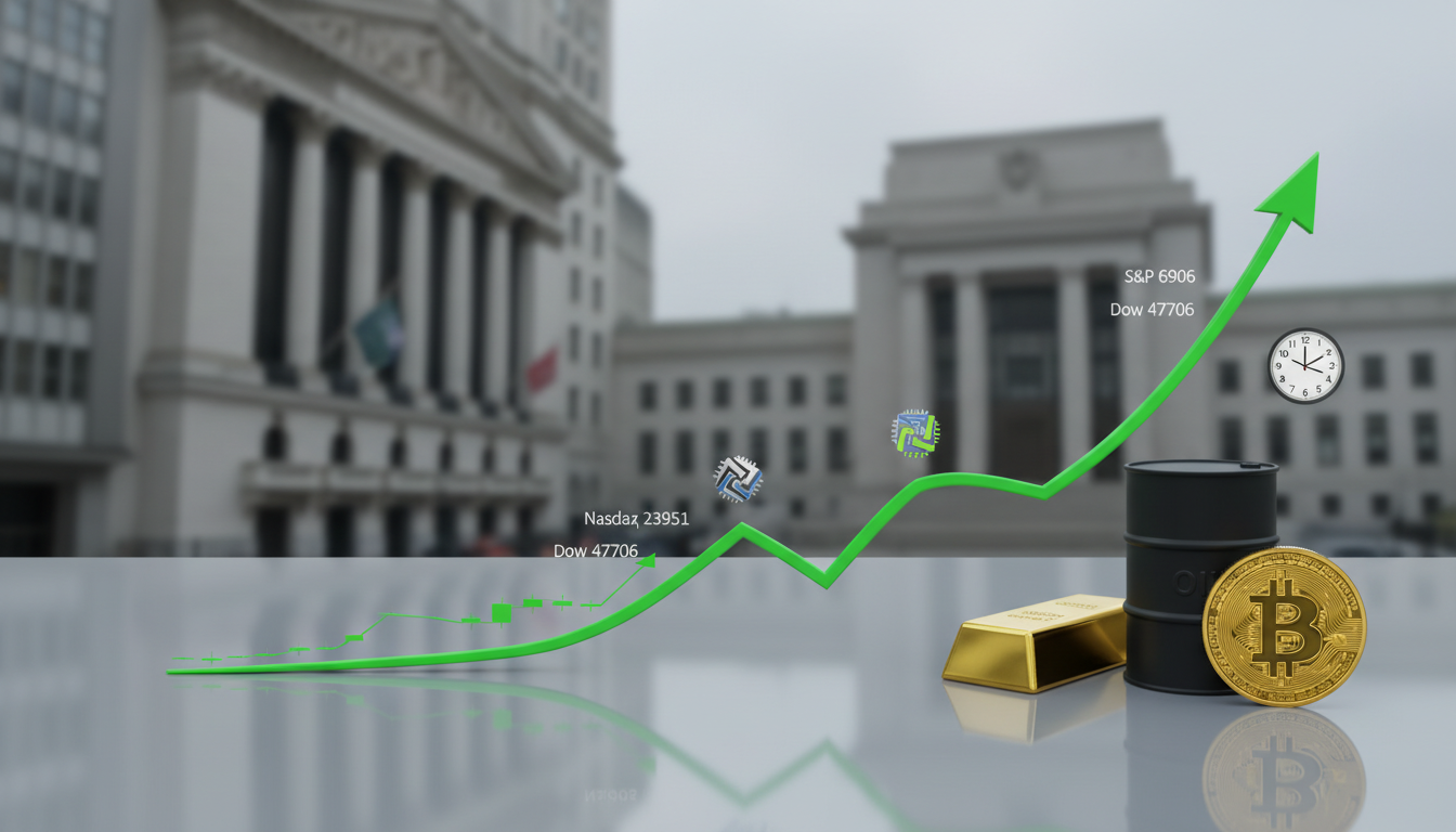 - S&P 500 climbs 0.25% to 6,906.95, Nasdaq surges 0.52% to 23,951, and Dow gains 0.3% to 47,706—all fresh records